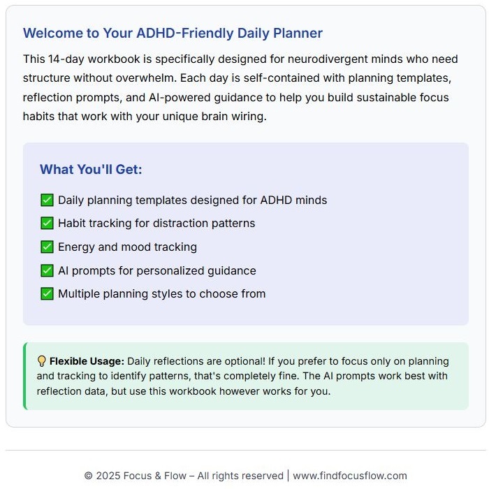 This 14-day journey will transform how you approach daily planning and give you the tools to build a sustainable focus system that actually works for your unique mind.